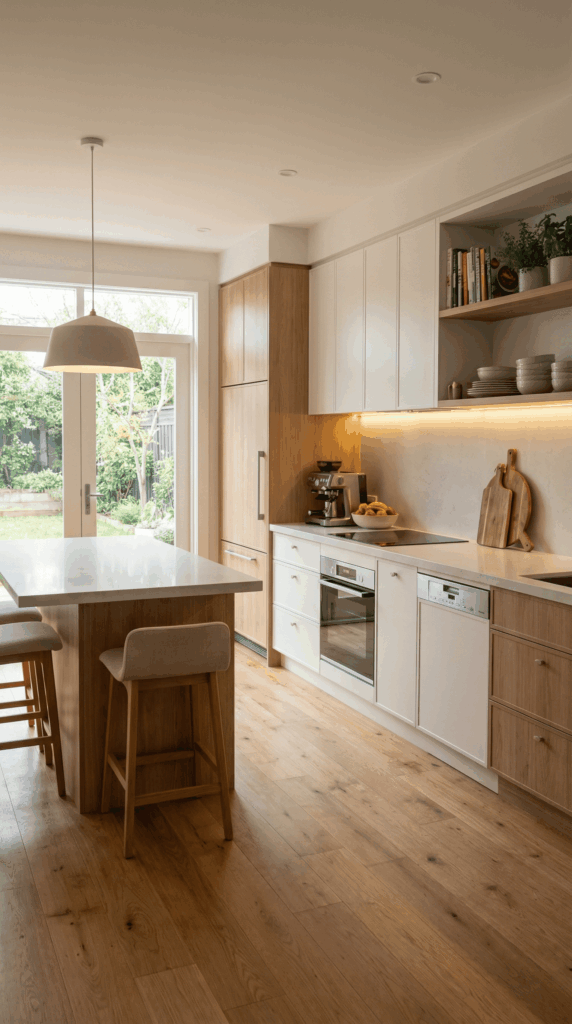 Reforma integral de una vivienda contemporánea donde se prioriza la entrada de luz natural, la continuidad espacial y el uso de materiales cálidos y duraderos. El proyecto combina carpinterías en madera natural, piedra clara y textiles neutros para generar un ambiente elegante, funcional y atemporal.